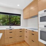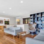 Upstairs is the heart of the home. The light-filled open-plan living, dining, and kitchen area flows seamlessly onto expansive decks on three sides, allowing you to follow the sun or find shade throughout the day. The front deck overlooks the stunning golden sands and crystal waters of Coopers Beach – the perfect spot for your morning coffee, long lunches, or sunset drinks.